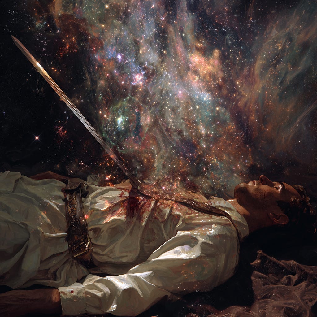 I found myself staring myself from a time in the past. From the background, a sword struck me through my right flank. It fully struck through my torso, causing me to bleed out.